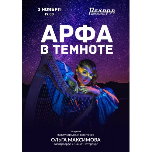 «Арфа в темноте» — уникальный перфоманс арфистки Ольги Максимовой. Медитативная музыка электроарфы сочетается с видеоинсталляцией, переходящей в темноту, из которой постепенно при помощи ультрафиолета и специального грима появляется образ арфистки.
