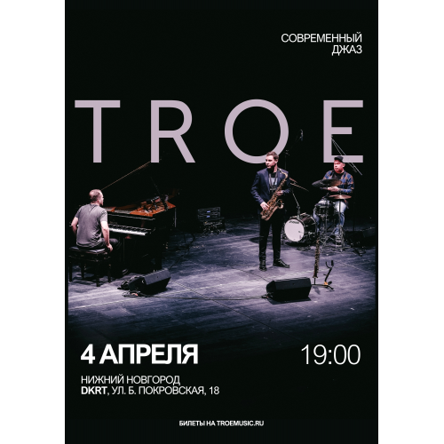 TROE - кроссовер-джаз коллектив родом из российских глубинок, трио в составе: рояль, саксофон, ударные. Название коллектива музыканты составили по именам своих малых родин - Taganrog-Rakhya-Oryol Ensemble (TROE).